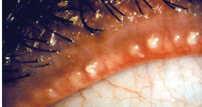 Это заболевание паренхимальных желез, которые расположены в толще хряща век. Веки пациента утолщаются и покрываются серовато-желтыми струпьями. Характерным симптомом этого вида блефарита является беловатая окраска, которая выделяется из век при надавливании. Конъюнктивит часто сопровождает этот тип заболевания.